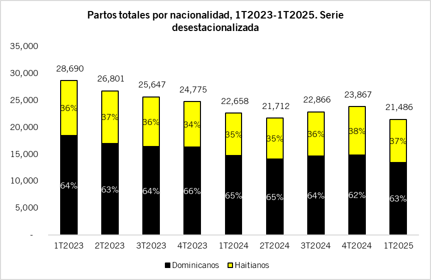 El aumento en la proporción de partos de mujeres haitianas en la totalidad de partos se explica por la marcada disminución de partos de las mujeres dominicanas y no por un número mayor de partos de las mujeres haitianas. En consecuencia, este cambio en la composición no representa una presión adicional sobre la capacidad hospitalaria ni compromete la disponibilidad de los servicios de salud en el país.